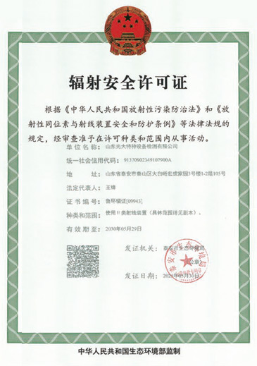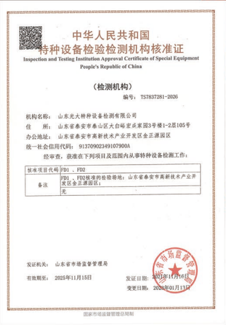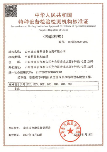 山東光大特種設(shè)備檢測有限公司是經(jīng)山東省市場監(jiān)督管理局核準(zhǔn)的甲類B1特種設(shè)備綜合檢驗(yàn)機(jī)構(gòu)。2017年9月30日取得了山東省市場監(jiān)督管理局頒發(fā)的《檢驗(yàn)檢測機(jī)構(gòu)資質(zhì)認(rèn)定證書》。2018年2月22日取得了山東省市場監(jiān)督管理局頒發(fā)的《特種設(shè)備檢驗(yàn)檢測機(jī)構(gòu)核準(zhǔn)證》(起重機(jī)械)檢驗(yàn)檢測資質(zhì)。2021年11月取得山東省市場監(jiān)督管理局版發(fā)的《特種設(shè)備檢驗(yàn)檢測機(jī)構(gòu)核準(zhǔn)證》(安全閥在線、離線)校驗(yàn)資質(zhì)。2023年11月取得山東省市場監(jiān)督管理局頒發(fā)的甲類檢驗(yàn)機(jī)構(gòu)B1《特種設(shè)備檢驗(yàn)檢測機(jī)構(gòu)核準(zhǔn)證》,具有壓力容器(RD2...